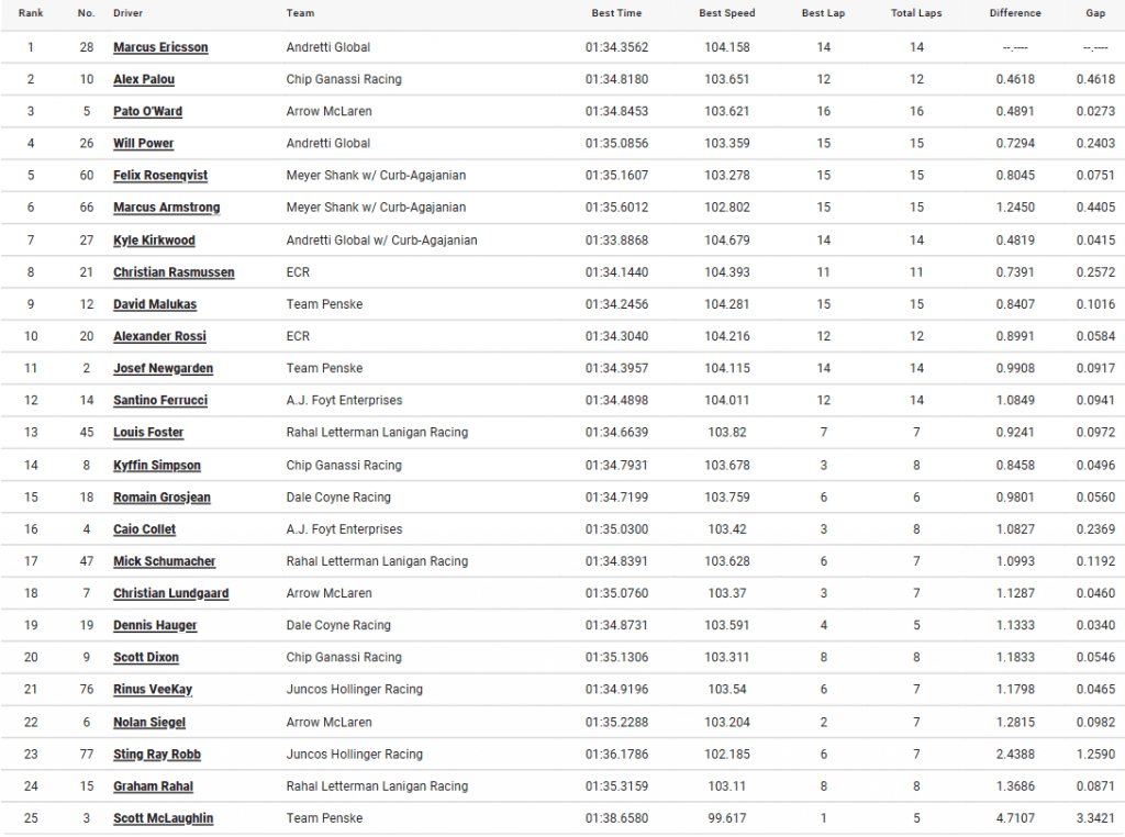 Álex Palou se pasó de largo en la curva 10 y se metió en la escapatoria, pudiendo retomar la marcha. Lo exigente de la pista forzó a todos los pilotos, dejando incluso ligeros toques al muro como el que dio Kyle Kirkwood, pero el estadounidense consiguió marcar el mejor tiempo a falta de algo más de 5 minutos para el final de la sesión.