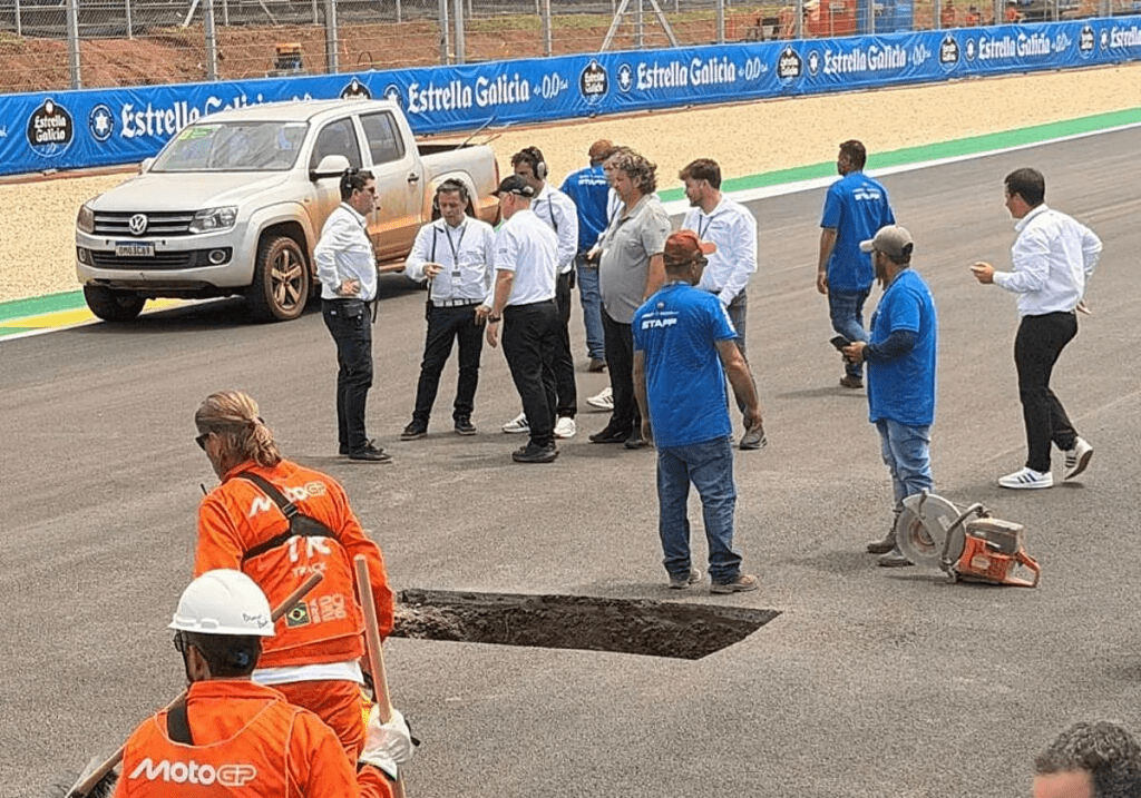 Cuando todo parecía listo para la carrera al sprint, el circuito de Goiânia traía una sorpresa insólita antes de reaparecer en MotoGP. En la recta principal, apareció un socavón. Esto obligó a la organización a retrasar la salida casi una hora y media para realizar reparaciones de urgencia, desplazando incluso las clasificaciones de Moto2 y Moto3 al domingo.