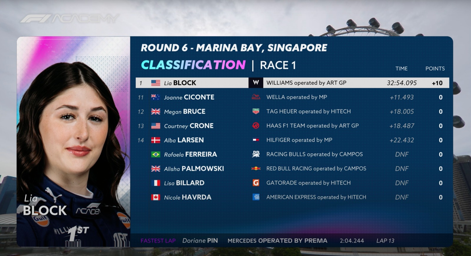 La protegida de Williams consigue su mejor resultado en el trazado de Marina Bay, mientras que Maya Weug recorta puntos a Doriane Pin