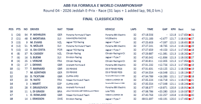 La primera de las dos fechas en el circuito de la Corniche de Yeddah trae de regreso a Pascal Wehrlein al liderato, mientras Pepe se atasca en el pelotón quedando delante de Felipe Drugovich. Repasemos lo más relevante del dia.